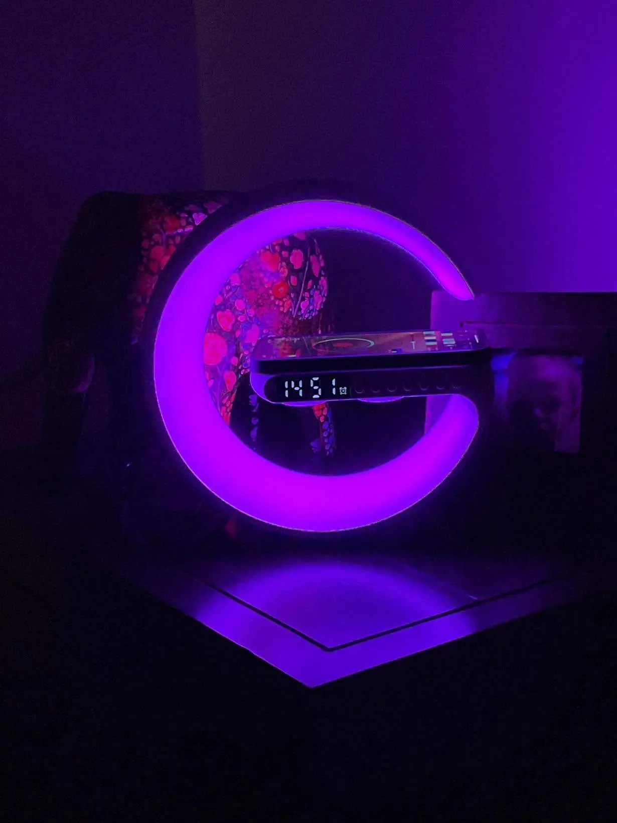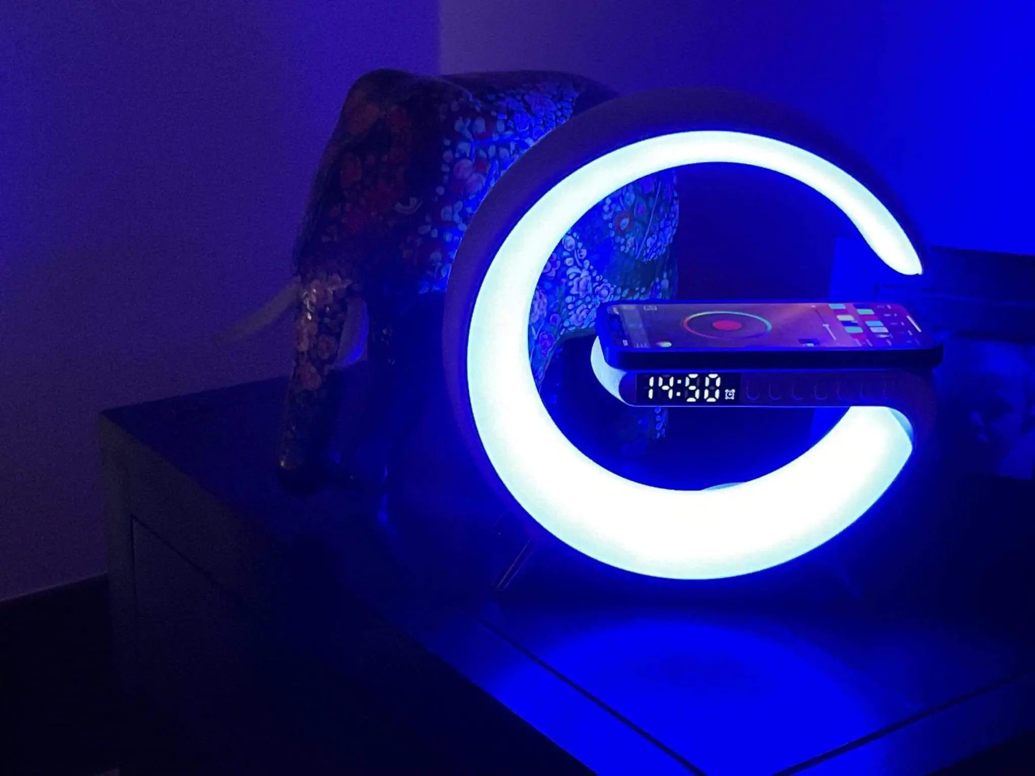 The device can be controlled using a mobile app, allowing the user to change the LED light colors, set alarms, play music, and charge their devices wirelessly.